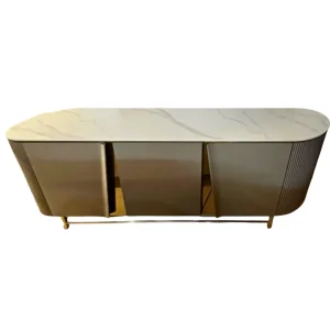 Bufete moderno con cubierta de mármol blanco y base metálica dorada de diseño geométrico. Aporta elegancia y sofisticación.