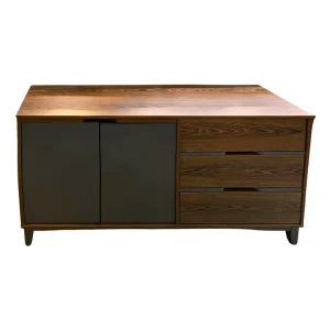 Buffete moderno en madera de tono oscuro. Diseño funcional con puertas y cajones en gris, ideal para almacenar y complementar tu espacio.