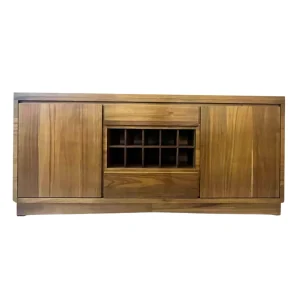 Buffete de madera marrón oscuro con diseño moderno. Incluye dos puertas laterales y dos cajones centrales. Ideal para almacenar vajillas y utensilios de cocina.