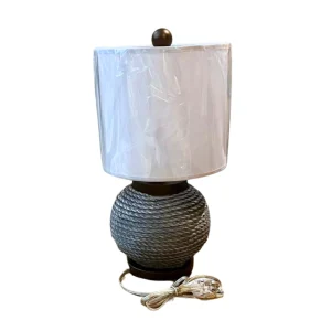 Lámpara de mesa con base gris de cuerda y pantalla blanca. Ideal para añadir un toque moderno y elegante a cualquier habitación.