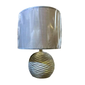 Lámpara de mesa con base esférica texturizada y pantalla cilíndrica de tela gris claro, perfecta para añadir estilo a cualquier espacio.