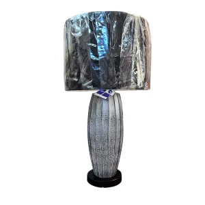 Lámpara de mesa con base metálica gris texturizada y pantalla en tono blanco. Diseño moderno para iluminar tu espacio con estilo