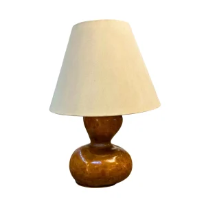 Lámpara de mesa con base marrón y pantalla beige. Diseño orgánico que ofrece una luz cálida y acogedora.