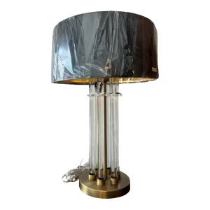 Lámpara de mesa con pantalla cilíndrica oscura y base de acrílico transparente con un diseño único. Modernidad y elegancia para tu espacio.