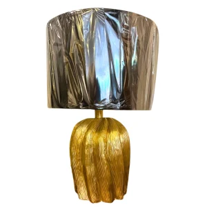 Lámpara de mesa dorada con base acanalada y pantalla oscura. Elegante y moderna, perfecta para cualquier ambiente.