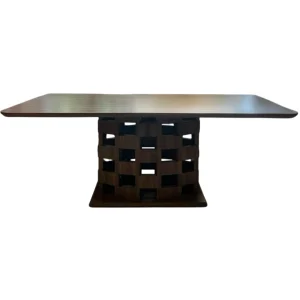 Mesa de comedor de madera oscura, elegante y rectangular, con una base intrincada, ideal para añadir estilo y funcionalidad a cualquier espacio.