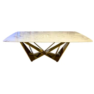 Mesa de comedor rectangular con superficie de mármol blanco veteado y base de metal dorado con diseño geométrico. Perfecta para un ambiente moderno y elegante.