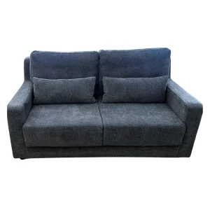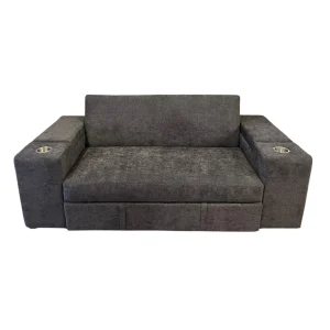 Sofá cama moderno gris oscuro de tela suave. Diseño funcional con portavasos integrados para tu máximo confort.
