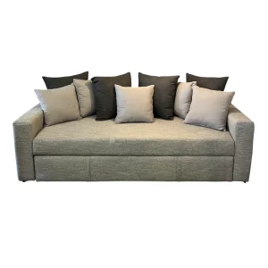 Sofá cama gris claro con cojines decorativos en tonos variados. Funcional y moderno, perfecto para maximizar el espacio en cualquier habitación.