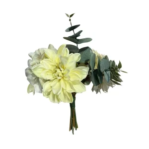 Ramo de flores artificiales con dalias amarillas y suculentas. Perfecto para una decoración fresca y moderna.