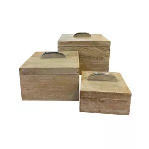 Elegantes cajas de madera en tono beige claro, con prácticos tiradores plateados. Perfectas para organizar con estilo y añadir un toque rústico-moderno. Chico 15 cm x 15 cm x 8 cm de alto. Mediano 20 cm x 20 cm x 13 cm de alto. Grande 26 cm x 26 cm x 18 cm de alto