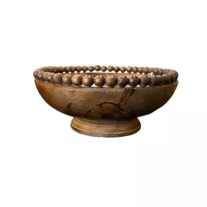 Cuenco charola de madera oscura con borde de cuentas. Ideal para centros de mesa o decoración.