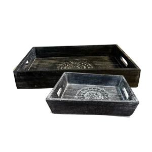 Bandeja grande de madera oscura con mandala tallado y acabado rústico. Perfecta para servir o decorar.