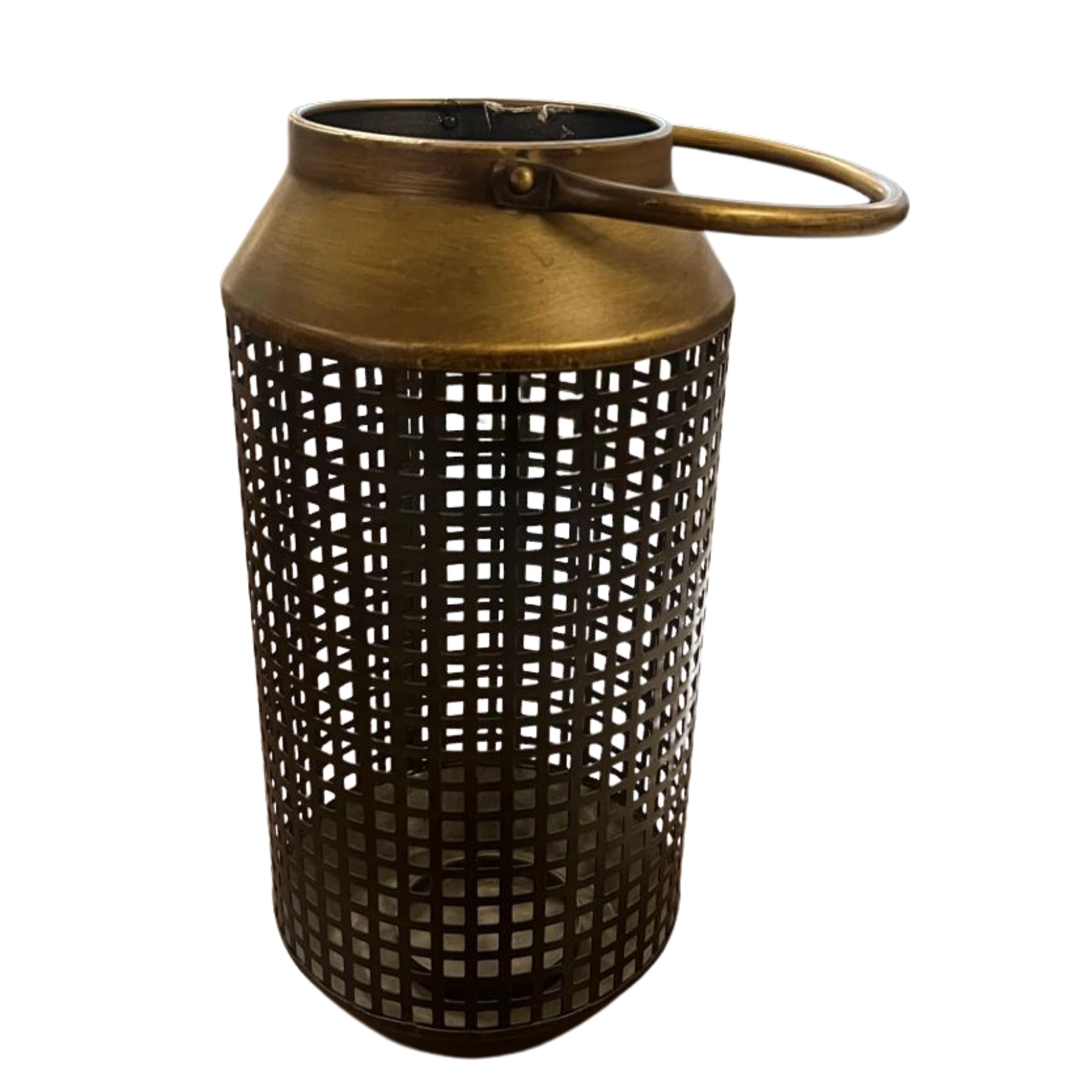 Farol de metal en acabado bronce oscuro, con estructura de rejilla y asa amplia. Perfecto para decorar y dar un toque cálido a cualquier espacio