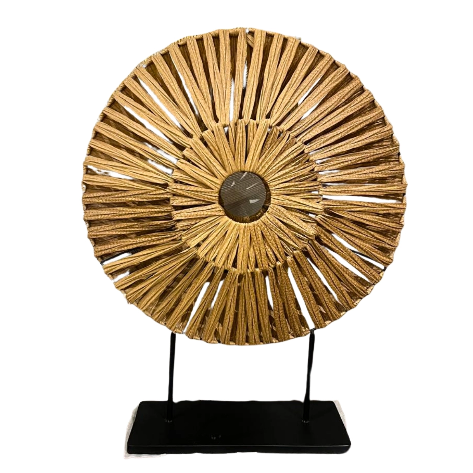 Figura decorativa elaborada en rafia y yute, con un diseño artesanal que resalta por su estilo natural y auténtico. Ideal para aportar un toque cálido y original a cualquier espacio