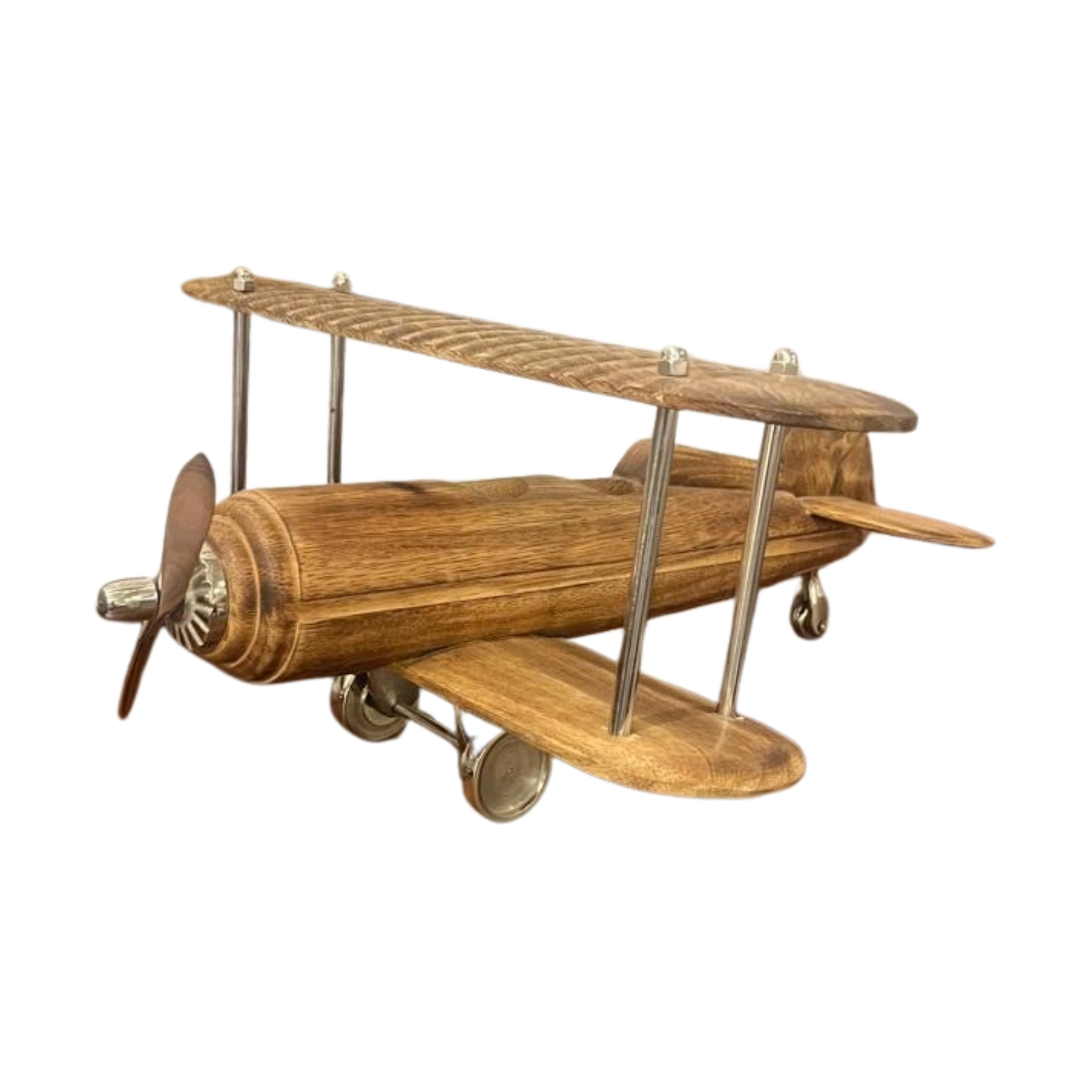 Figura decorativa de avión en estilo vintage, fabricada en madera con detalles metálicos. Ideal para añadir un toque clásico y nostálgico a repisas, escritorios o estanterías.