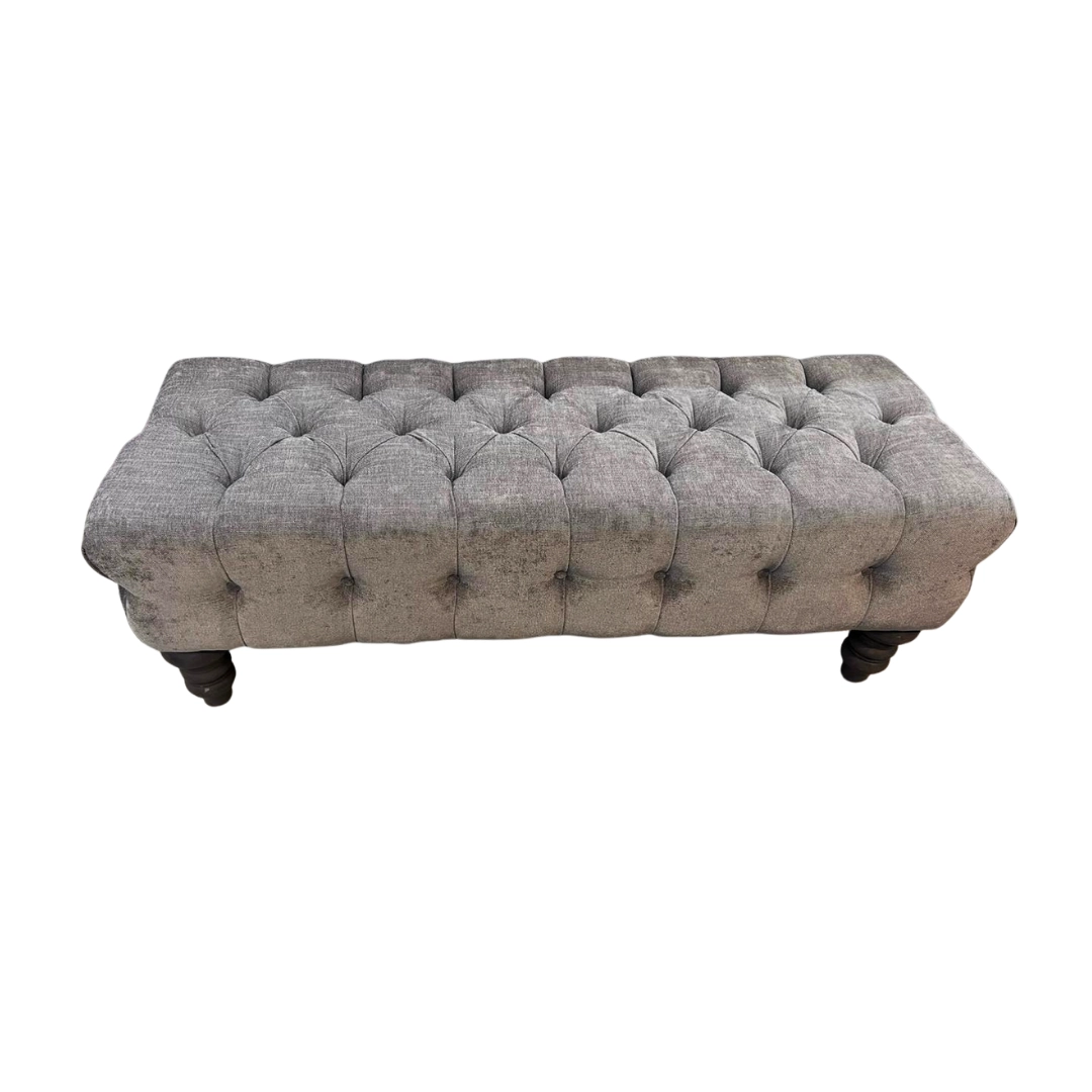 Banca otomana capitonada en gris. Elegante y funcional, con patas de madera oscura para un toque de distinción.