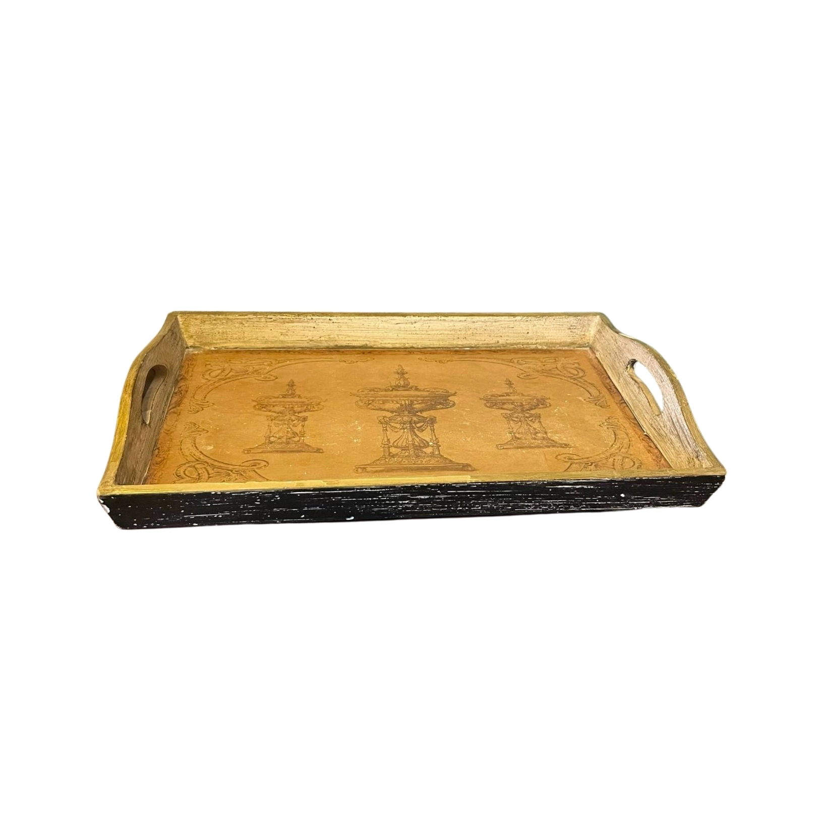 Bandeja de madera rectangular con acabado envejecido y bordes ornamentados, perfecta para un toque elegante.