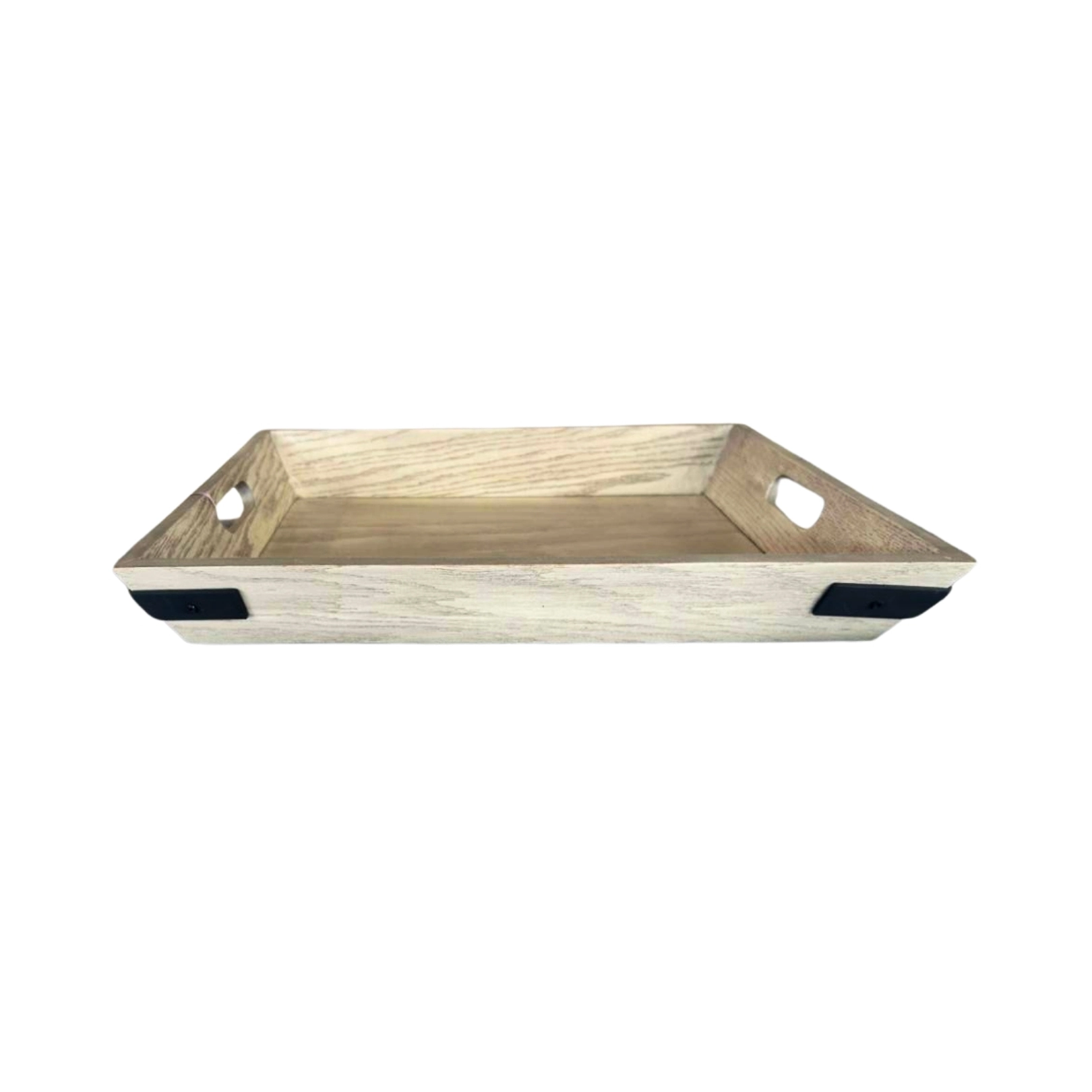 Bandeja rectangular de madera con acabado desgastado en blanco y gris, con asas. Perfecta para servir con elegancia.
