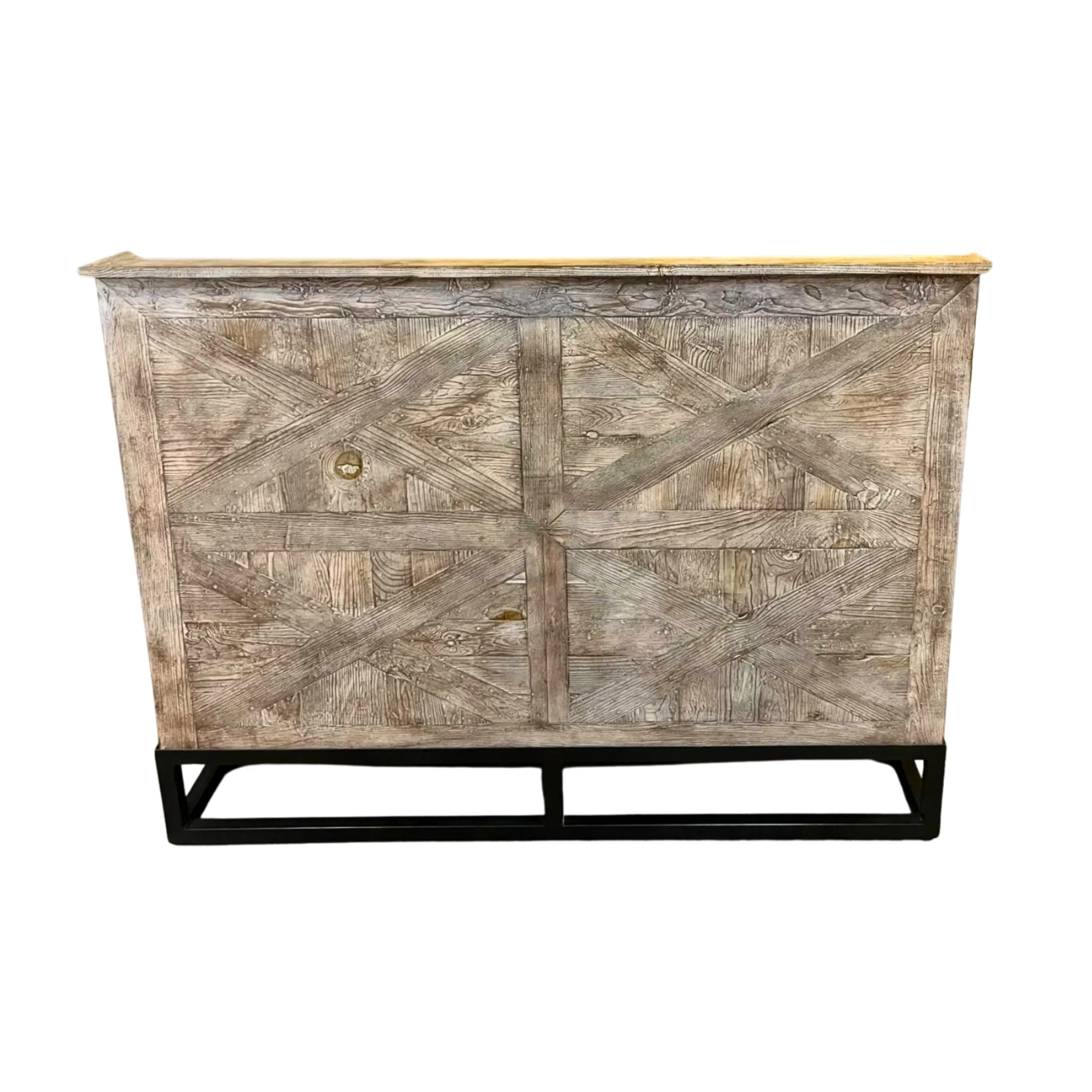 Barra de madera rústica con dos cajones y estantes abiertos. Base de metal negro que aporta un toque industrial. Perfecta para cualquier espacio.