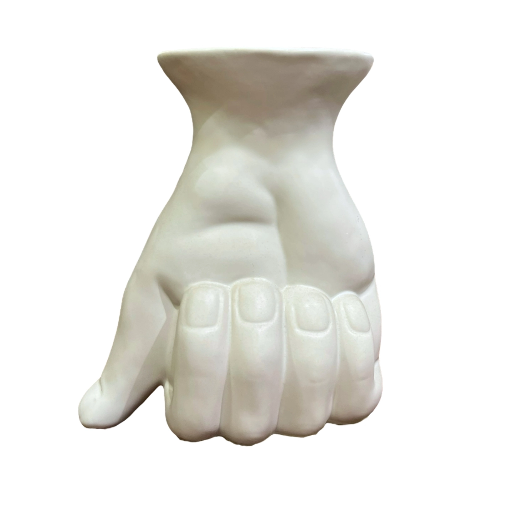 Base de cerámica blanca en forma de puño cerrado, con detalles realistas. Ideal como pieza decorativa moderna.