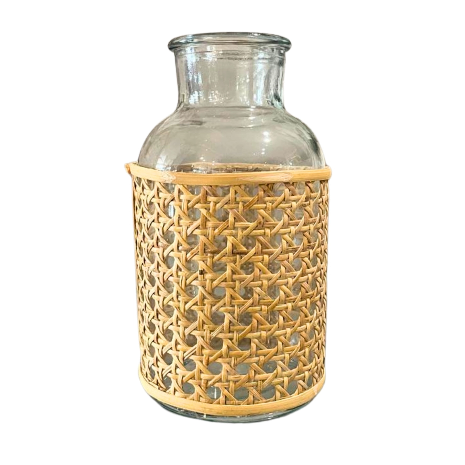 Botella con bejuco beige claro. Ideal para un toque elegante en la decoración.