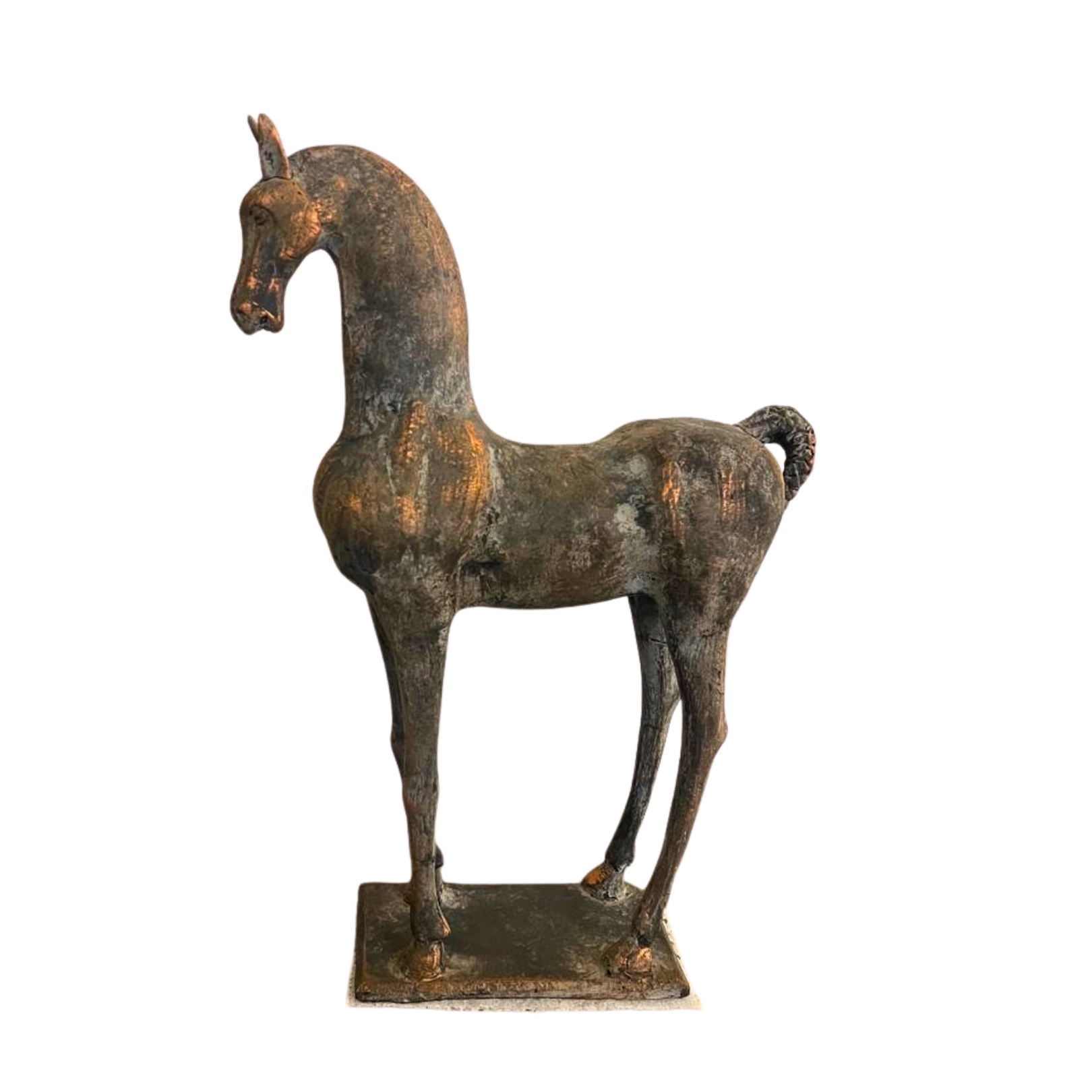 Escultura de caballo en marrón oscuro con detalles en cobre. Un diseño elegante y detallado, ideal para realzar la decoración de cualquier espacio