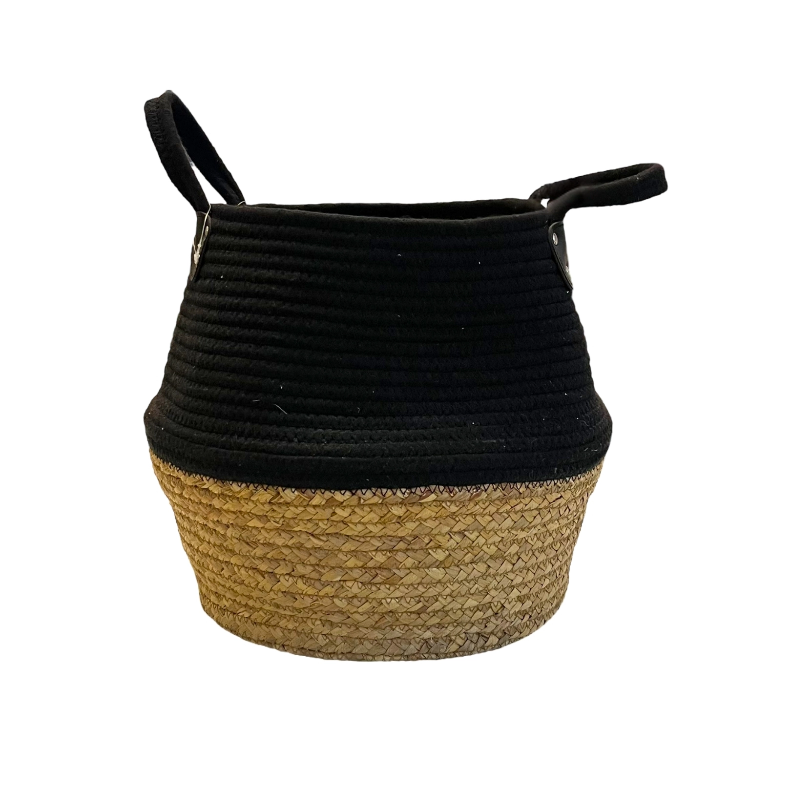 Canasta cilíndrica grande moderna en tela negra y material natural. Añade estilo y organización a tu hogar.