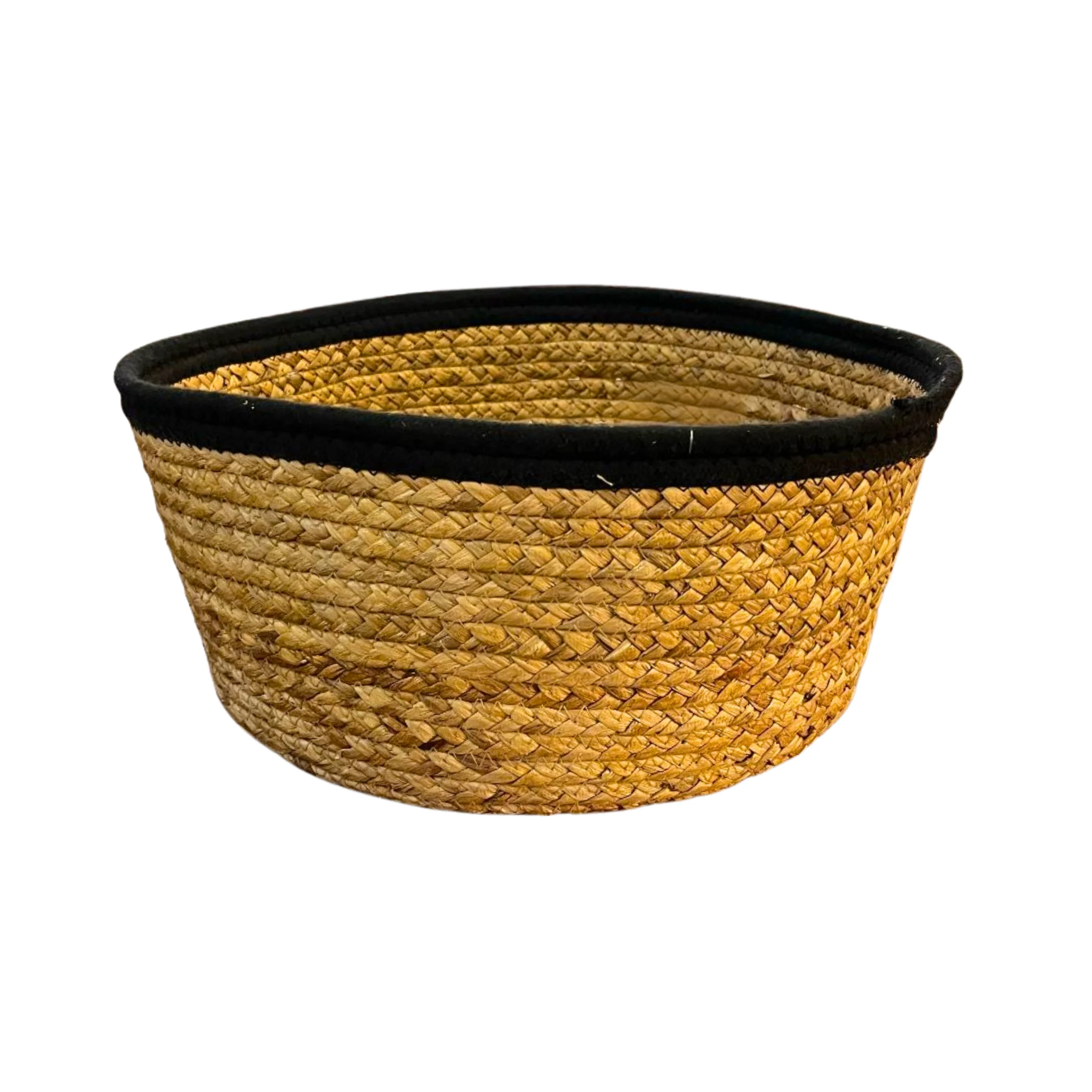 Cesta de mimbre con borde negro, elegante y funcional para almacenamiento.