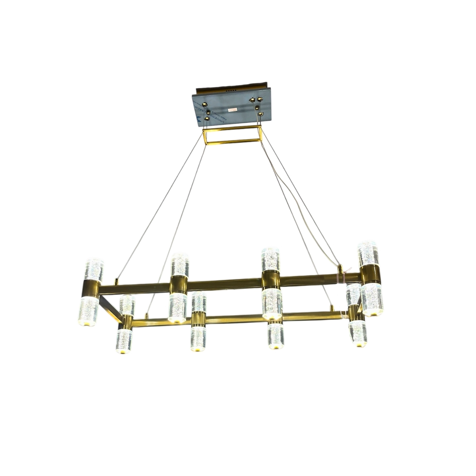 Candil Bilbao rectangular en dorado, con elegantes luces de cristal que aportan un toque sofisticado y moderno a cualquier espacio.