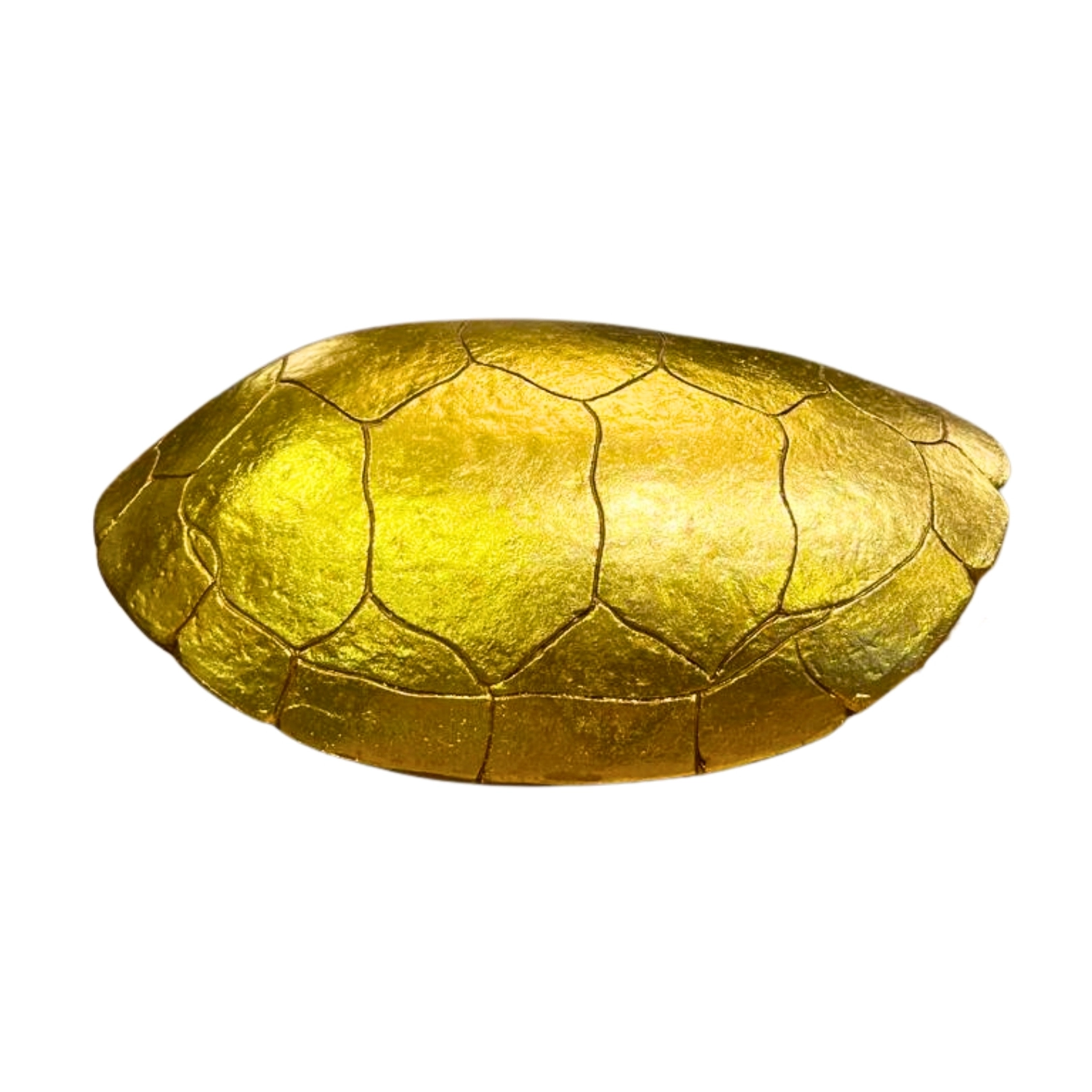 Caparazón de tortuga dorado con acabado brillante y detalles grabados. Perfecto como pieza decorativa única.