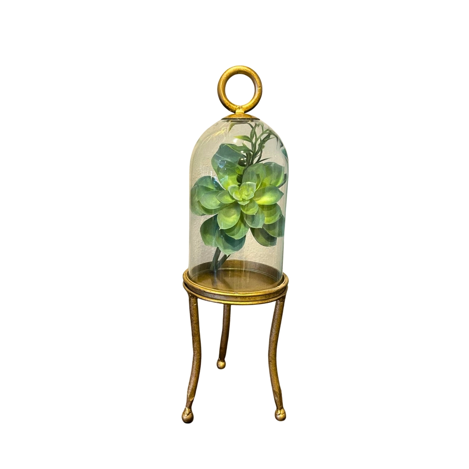 Capelo de cristal con base dorada y planta artificial. Un toque de naturaleza y estilo para realzar cualquier rincón.
