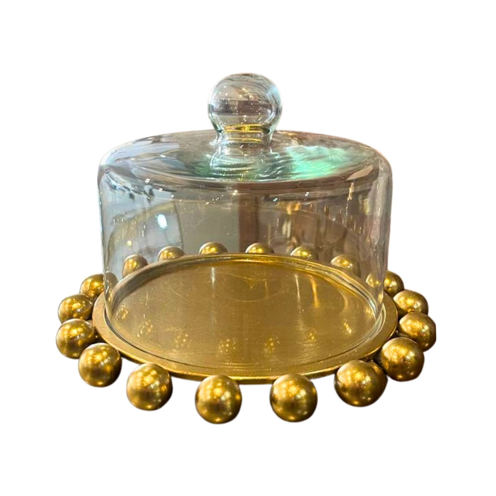 Capelo de cristal dorado con base circular y esferas, perfecto para resaltar objetos decorativos con elegancia.