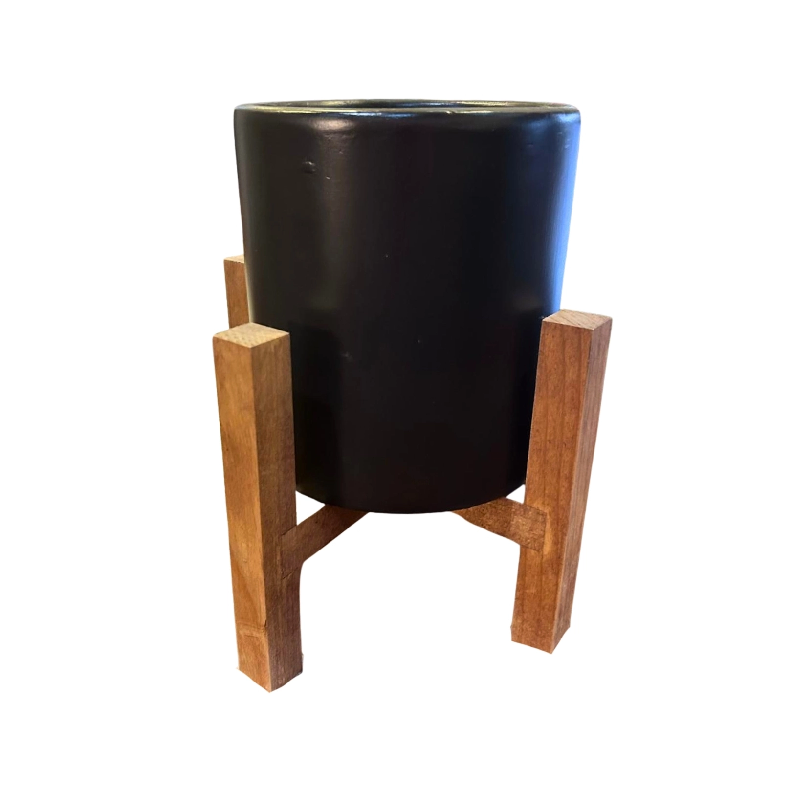 Maceta cilíndrica de cerámica mate oscura con base de madera. Diseño moderno para tus plantas