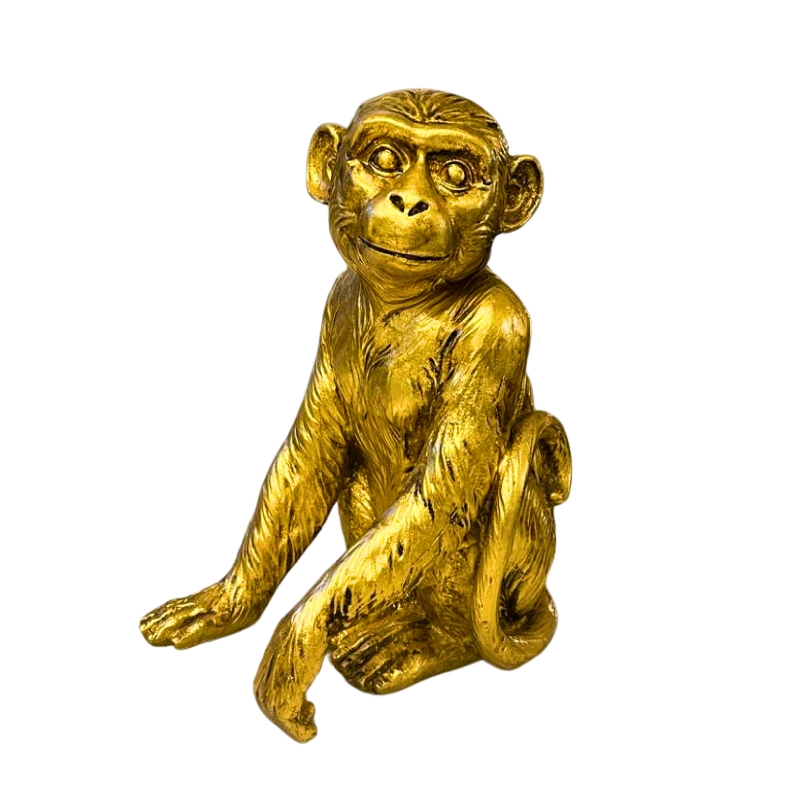 Escultura de mono dorado sentado, con acabado metálico brillante. Perfecta para un toque artístico.