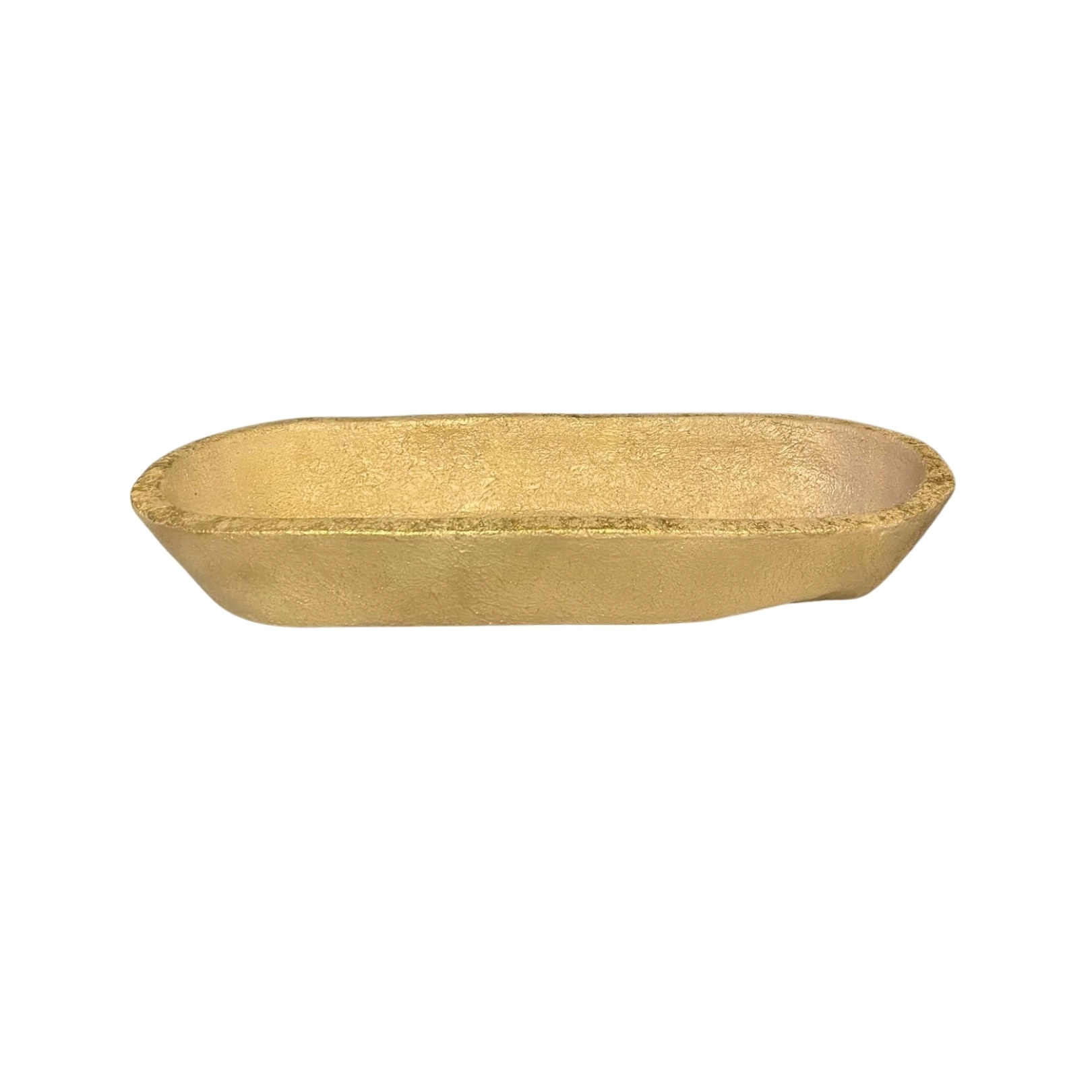 Charola ovalada de color dorado pálido con textura rugosa. Ideal como pieza decorativa elegante.
