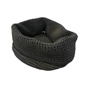 Canasta tejida de ganchillo negra rectangular, con borde grueso. Ideal para organización y decoración.
