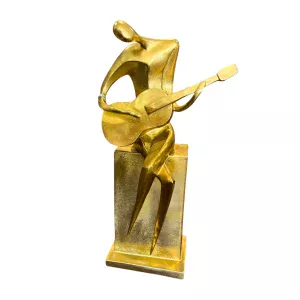Escultura dorada de músico sentado tocando guitarra, ideal para un toque artístico.