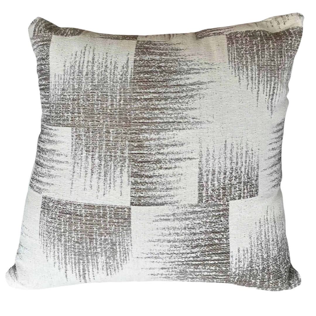 Cojín cuadrado beige con diseño de bloques texturizados. Un toque artesanal y acogedor.