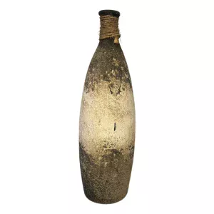 Juego de jarrones decorativos de barro en tonos beige y gris oscuro, con acabado desgastado y detalle en cuerda de yute. Ideales para añadir un toque rústico a tu decoración. Medidas: Grande 46×15 cm, Mediano 41×13 cm y Chico 37×12 cm