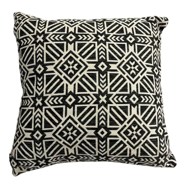 Cojín cuadrado con diseño geométrico en blanco y negro. Aporta un toque moderno a la decoración.