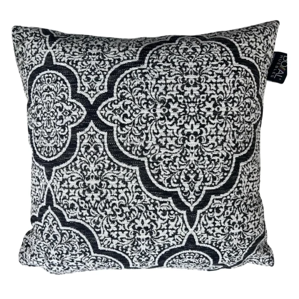 Cojín cuadrado con diseño en blanco y negro. Aporta un toque moderno a la decoración.