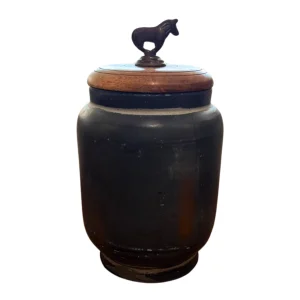 Bote de cerámica oscura con tapa decorada con un caballo de metal envejecido. Ideal para almacenar objetos con estilo. Grande 25 de alto x 13 de ancho. Mediano 23 de alto y 13 de ancho. Chico 20 de alto y 13 de ancho
