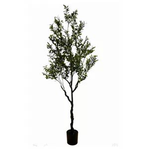 Árbol artificial de olivo con ramas verdes y olivas negras en maceta negra. Perfecto para un toque natural en interiores.