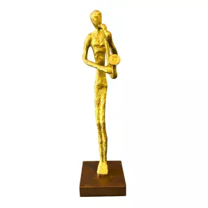 Escultura dorada de un saxofonista. Ideal para decorar cualquier espacio.