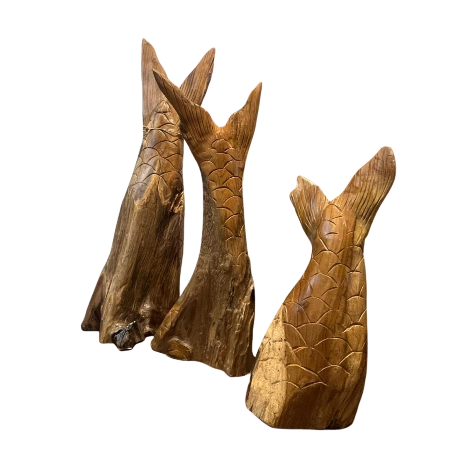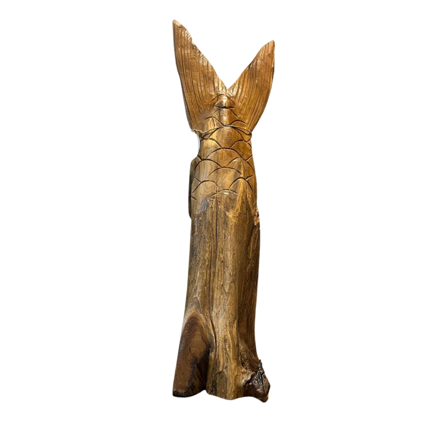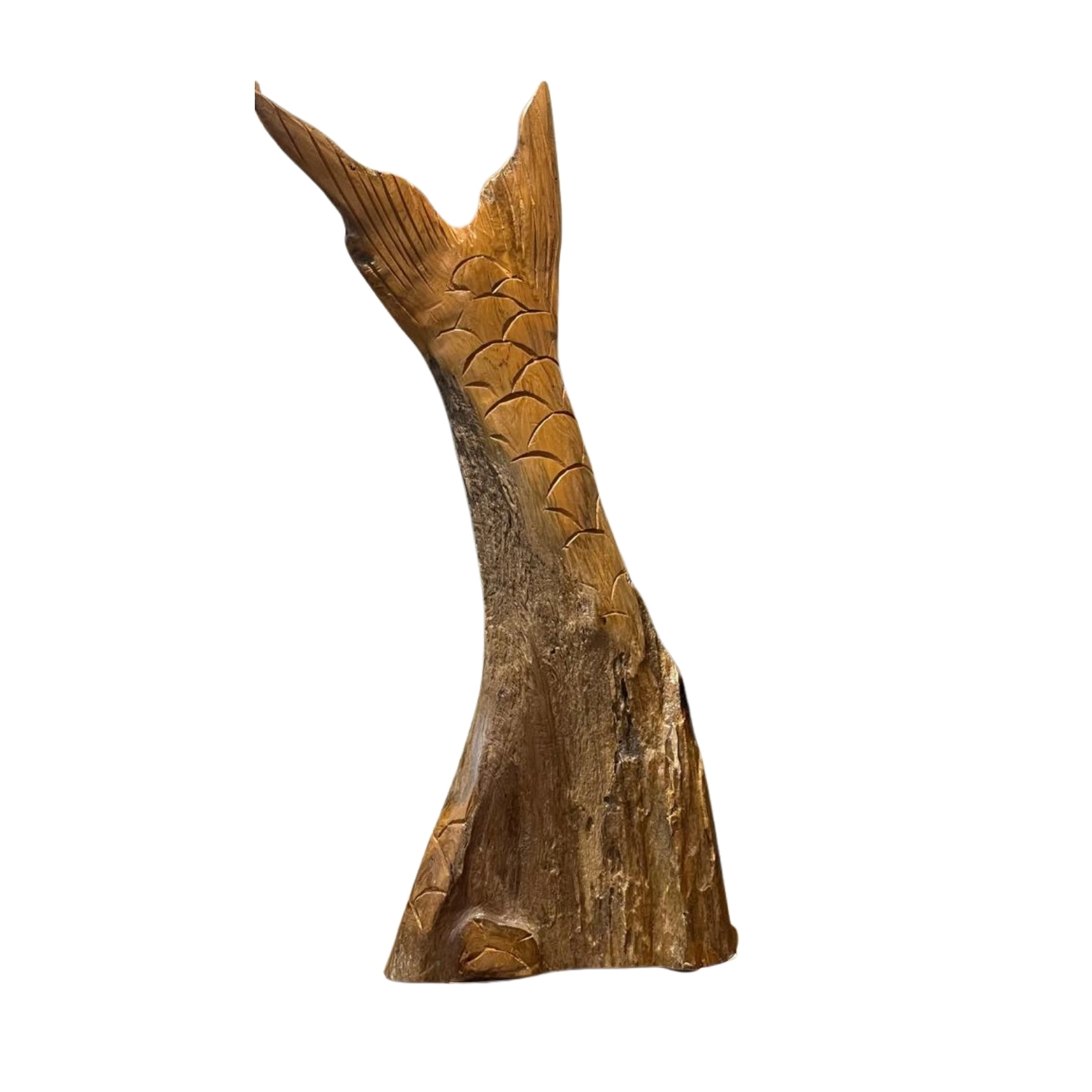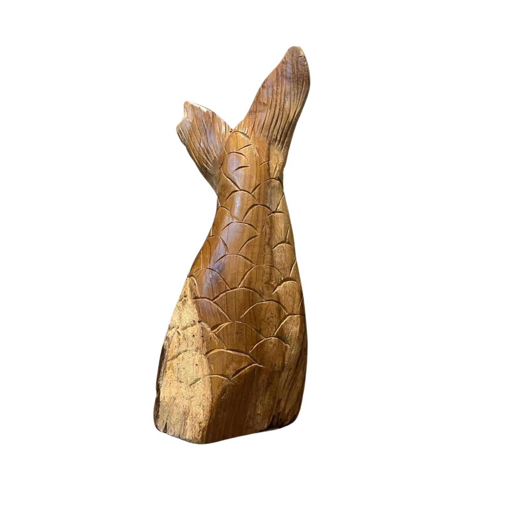 Escultura de madera en forma de cola de ballena, elaborada en teca de tono marrón claro. Sus detalles tallados imitan escamas, convirtiéndola en una pieza ideal para una decoración naturalista y elegante.