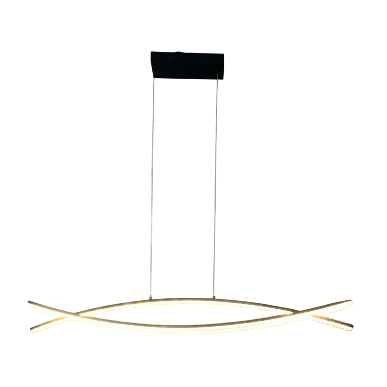 Lámpara colgante moderna de diseño curvo. Emite luz cálida, ideal para un toque acogedor en cualquier espacio.