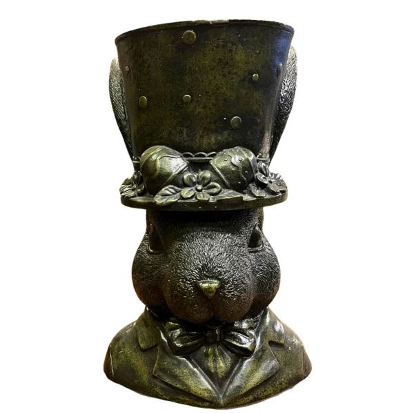 Maceta decorativa en forma de conejo negro verdoso con sombrero. Perfecta para añadir un toque original a cualquier espacio.
