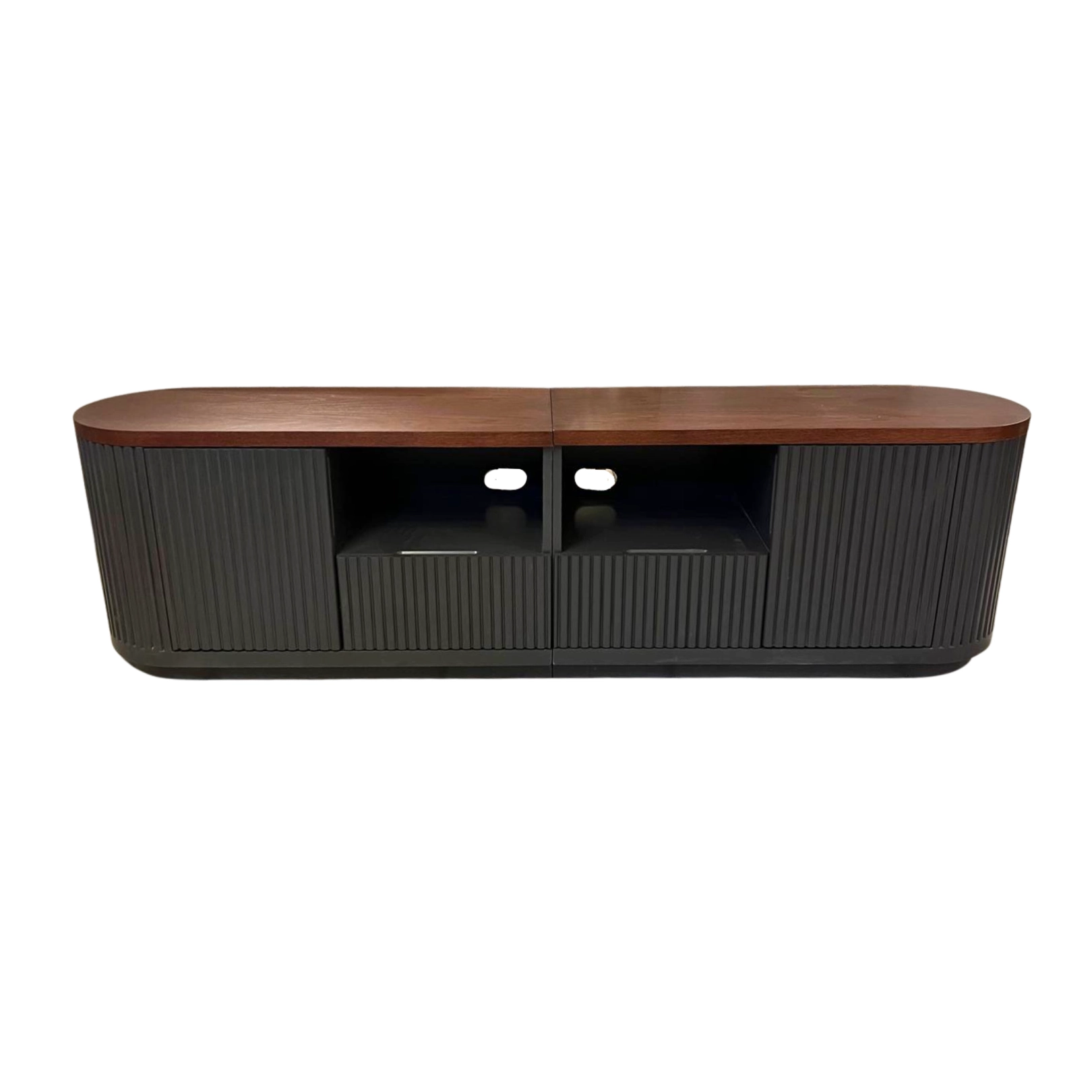 Consola de televisión gris oscuro con detalles acanalados y tapa de madera, un toque moderno y funcional