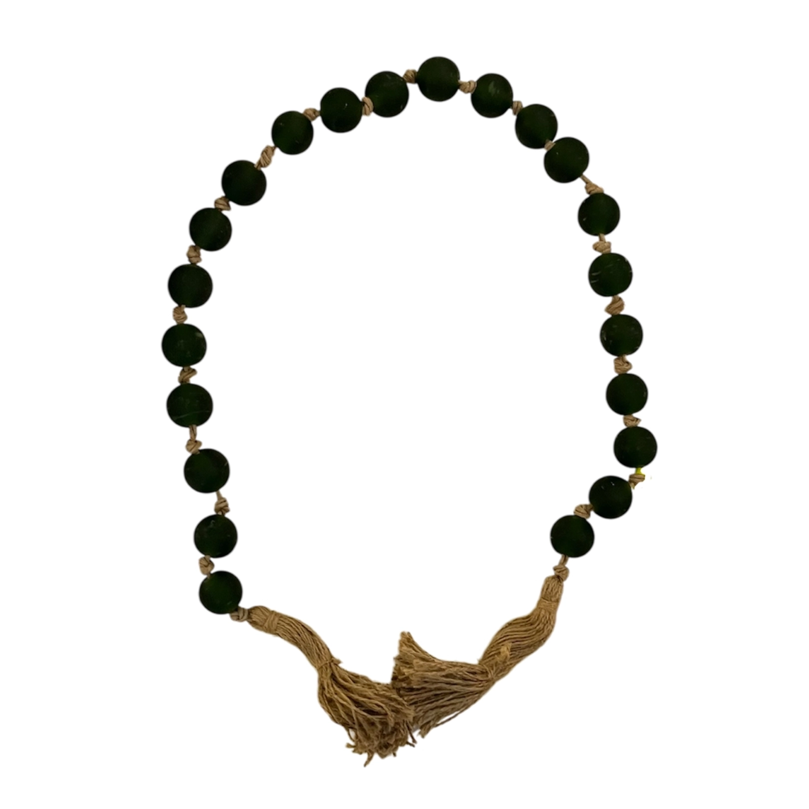 Rosario artesanal de cuentas verdes oscuras en hilo de yute beige, que aporta elegancia y un estilo único. Perfecto como accesorio distintivo.